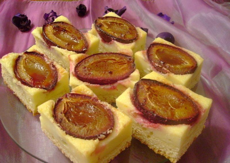 Într-un castron frecăm bine brânza de vaci cu 50 g zahăr. În alt castron batem bine albușurile cu 50 g zahăr, după care se amestecă ușor cu brânza. Această compoziție de brânză se pune cu o lingură peste compoziția din tavă și se întinde ușor. Aranjăm prunele una lângă alta. Presărăm 2 linguri de zahăr tos peste prune. Se dă la cuptor pentru 30 - 40 minute la 180 grade C.