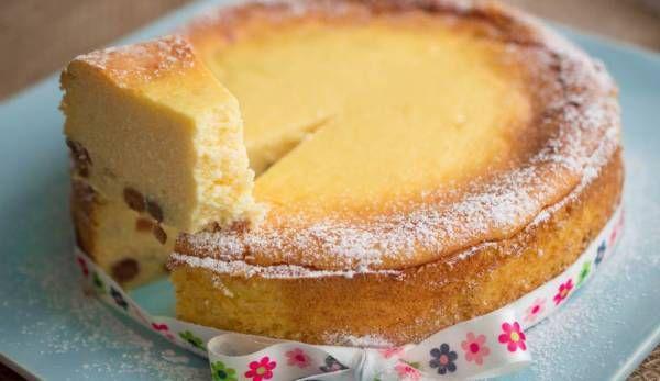 Mod de preparare: Cuptorul se preîncălzeşte la 160 de grade Celsius. Ouăle se separă. Gălbenuşurile şi zahărul se freacă bine cu untul şi un praf de sare, folosind un mixer, până se topeşte zahărul. Se adaugă brânza, smântâna, apoi făina amestecată cu praful de copt şi se amestecă bine, până se desfac cocoloaşele. Albuşurile se bat spumă, separat. Când s-au întărit suficient, se încorporează cu o spatulă în amestecul cu gălbenuş. Se adaugă vanilia, coaja de lămâie şi se amestecă uşor. La final se adaugă stafidele. Compoziţia se toarnă într-o formă rotundă unsă cu puţin unt. (Deasupra se presară cacao.) Se coace 45-50 de minute. Se serveşte caldă sau rece, după preferinţă.