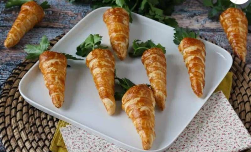Mod de Preparare: Tăiați aluatul foitaj în fâșii de aproximativ 1 cm lățime. Ies cam 16 fâșii dintr-un foitaj dreptunghiular. Tăiați pătrate din folia de aluminiu și împăturiți-le în 4. Apoi formați conuri, rulându-le. Înfășurați o fâșie de aluat foitaj în jurul unui con de aluminiu și repetați procedeul cu toate fâșiile. Aranjați conurile pe o tavă de copt tapetată cu hârtie de copt. Ungeți cu gălbenuș și coaceți 15 minute la 180°C. Între timp, tăiați roșiile uscate în bucăți mici și amestecați-le cu brânză de capră. Transferați amestecul într-o pungă. Scoateți folia de aluminiu de pe conuri rotindu-le pentru a le desface mai ușor. Umpleți conurile cu amestecul de brânză + roșii uscate. Puneți o frunză de pătrunjel în vârf pentru a forma morcovi mici și iată!