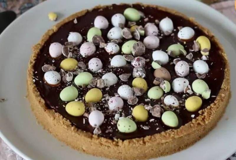 Ganache-ul: Se încălzește smântâna lichidă și se toarnă peste ciocolata tăiată bucățele mici. Amestecați până obțineți un ganache cremos. Turnați ganache-ul peste caramel. Răciți timp de 15 minute. Puneți ouăle de ciocolată în ganache, apoi dați din nou la rece timp de 45 de minute. Puteți adăuga ouă de ciocolată sparte în loc de ouă colorate.