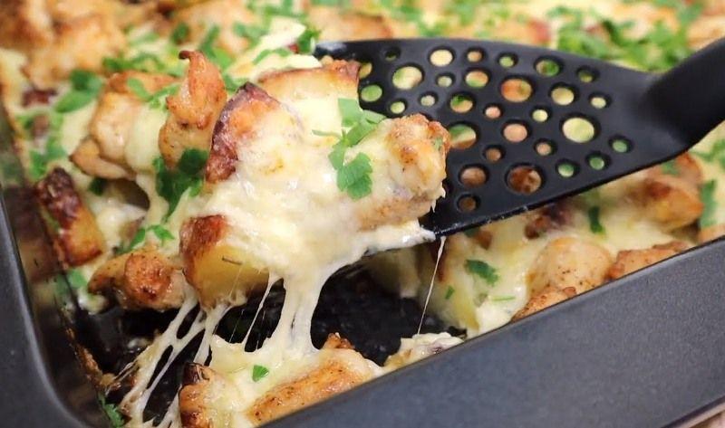Mod de Preparare: Cartofii se curata si se taie felii potrivit de groase. Pieptul de pui taiat cubulete se condimenteaza dupa gust cu sare, piper, boia de ardei si ghimbir. Intr-un vas termorezistent uns cu unt punem un strat de felii de cartof, saram si piperam dupa gust. Acoperim cu pieptul de pui, untul taiat cubulete si inca un strat de felii de cartof. Presaram cu cascavalul ras si dam la cuptor, la foc mediu, pana se rumenesc.