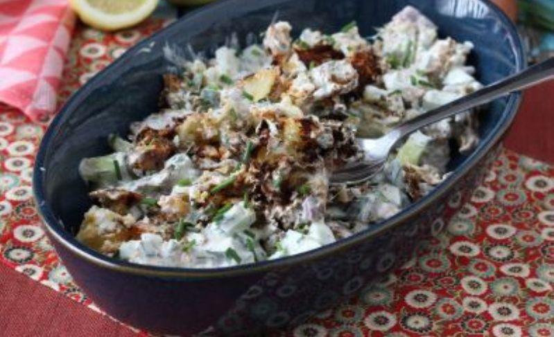 Mod de Preparare: Fierbeți cartofii în apă clocotită cu sare, timp de 20 de minute, până când se înmoaie (înțepați cu un cuțit pentru a verifica starea de fierbere). Așezați cartofii în tava de la Air Fryer și puneți hârtie de copt. Zdrobiți cartofii cu dosul unui pahar. Se adaugă un strop de ulei de măsline, sare, piper și condimentele la alegere (noi am ales boia de ardei și cimbru). Gătiți timp de 20 de minute la 180° în modul „Air Fry”, întorcându-i la jumătatea gătitului. Între timp, pregătiți salata de castraveți tăind cubulețe fine șalota, cepșoara, mărarul și castraveții, într-un bol de salată. Adăugați iaurtul grecesc, sare, piper și amestecați bine. Adăugați cartofi zdrobiți în salata de castraveți.
