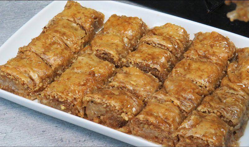 Mod de preparare: Se unge o tavă cu unt și se așază 3-4 foi stropite între ele cu unt cald. Pe deasupra lor se presară un strat de nuci pisate, iar peste ele se pune din nou un strat de 3-4 foi unse între ele cu unt cald și apoi iar se presară un strat de nuci pisate. Se fac astfel atâtea straturi cât este înălțimea tăvii sau atât cât doriți să fie de groasă baclavaua. Când sunt gata aranjate toate straturile, se taie baclavaua în lung și în lat cu un cuțit înmuiat în unt fierbinte, formând romburi sau dreptunghiuri cu laturile de 4-5 cm. Se stropesc pe deasupra cu restul de unt topit și se pun la cuptor la foc mic aproximativ 40-50 minute, până când vedeți că sunt bine rumenite. Se prepară un sirop din două pahare de apă, în care ați pus zahărul și plicul de zahăr vanilat. Se fierbe bine până când siropul capătă o ușoară consistență, apoi când baclavaua este rumenită, o parte din sirop se toarnă în tavă peste ea și se mai pune la cuptor cam 10-15 minute, până când siropul pătrunde bine. După ce este gata o lăsați la răcit și turnați restul de sirop rămas peste ea.