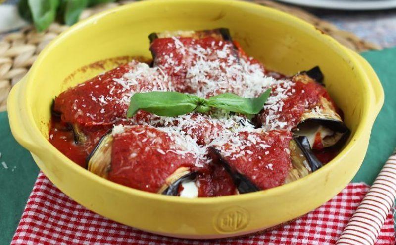 Mod de Preparare: Taiati vanata in felii, pe lungime. Aranjati feliile pe o tava de copt tapetata cu hartie de pergament. Se toarna un strop de ulei de masline. Sarati si pierati. Taiati rosii in felii si puneti rosiile feliate deasupra feliilor de vanata. Puneti-le in cuptorul preincalzit la 210° C timp de 35 de minute. Lasati vinetele sa se raceasca inainte de a le manipula. Asezati o felie de mozzarella pe fiecare felie de vineta si rulati. Așezati rulourile intr-un vas de gratin, acoperiti cu sos de rosii si presarati parmezan ras. Puneti la cuptor pentru 10 minute la 210° C. Gata! Puteti adauga deasupra frunze de busuioc pentru aroma si decor.