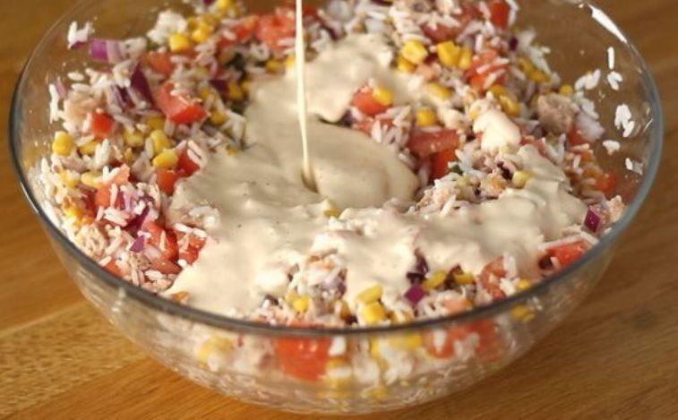 Sosul: Se amesteca toate ingredientele impreuna pentru a avea un sos fin. Adaugati-l peste salata de orez si amestecati bine. Gata!