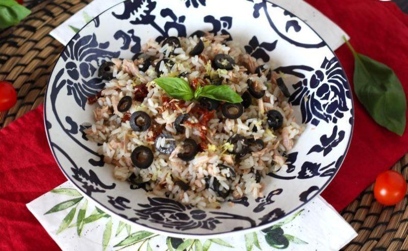 Mod de Preparare: Gătiți orezul conform instrucțiunilor de pe ambalaj. Scurgeți orezul și lăsați-l să se răcească pe o farfurie. Pregătiți toate ingredientele care vor merge în salată: Scurgeți tonul și fărâmați-l Tăiați măslinele negre felii Spălați bine lămâia și îndepărtați coaja, Scurgeți roșiile uscate și tăiați-le în bucăți mici Transferați orezul într-un bol când s-a răcit. Adăugați tonul, măslinele negre și roșiile uscate la soare. Amestecați bine. Puneți uleiul de măsline apoi adaugați coaja de lămâie. Amestecați totul bine. Ajustați condimentele dacă este necesar și serviți cu busuioc proaspăt! E gata!