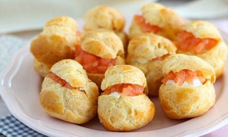 Umplutura: Taiati somonul in bucati foarte mici. Păstrati o treime pentru a decora. Se amesteca restul cu celelalte ingrediente ale umpluturii. Taiati capacul fiecarui choux si umpleti-l cu amestecul pregatit anterior, apoi acoperiti cu bucati mici de somon. Puneti capacul la choux.