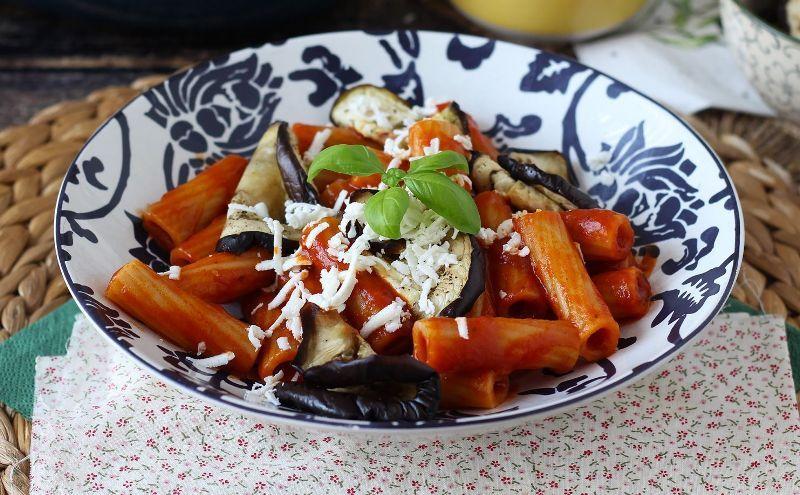 Paste: Fierbeți un volum mare de apă cu sare grunjoasă (10 g sare/L apă). Gătiti pastele al dente (timpul este indicat pe ambalaj). Scurgeți pastele și transferați-le în sosul de roșii. Terminați de gătit pastele în sos. Serviți pastele într-o farfurie adâncă, adăugați bucăți de vinete și radeți ricotta sărată peste ele. Presărați deasupra frunze de busuioc. Gata!