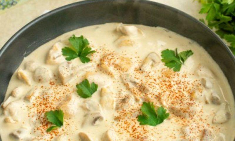 Mod de preparare: Încălziți uleiul într-o tigaie la foc mediu. Puneți pieptul de pui în tigaie întreg sau tăiat cuburi și gătiți până când se rumenește pe toate părțile. Luați de pe foc și păstrați-l acoperit pentru a se menține cald. În grăsimea rămasă în tigaie căliți ceapa tăiată mărunt până când se înmoaie puțin, apoi adăugați ciupercile tăiate. Lăsați ciupercile să se gătească până când scade lichidul pe care l-au lăsat și se rumenesc frumos. Turnați vinul alb și lăsați 1-2 minute sa se evaporeze alcoolul. În tigaie va rămâne doar aroma grozavă de vin. Peste ciuperci puneți bucățile de carne păstrate deoparte, apoi turnați smântâna. Potriviți gustul de sare și piper și lăsați mâncarea să mai fiarbă încă 1 minut la foc mic. Dați tigaia jos de pe foc, adăugați usturoiul trecut prin presă și serviți imediat cu pătrunjel proaspăt.