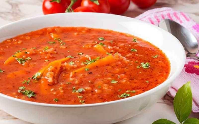 Mod de preparare: Tăiați cubulețe toate legumele. Puneți uleiul la încins într-o oală încăpătoare. Căliți mai întâi ceapa și usturoiul. Tot acum puneți în oală și o crenguță de busuioc proaspăt. Va lăsa o aromă plăcută și pregnantă. Adăugați și celelalte legume și lăsați-le să se călească câteva minute, până când încep să se înmoaie. Turnați 1.5 litri de apă peste legumele din oală. Adăugați sare, piper și fulgii de chilli. Lăsați supa să fiarbă acoperită cu capac, la foc mic, până când legumele sunt gătite. Între timp spălați orezul sub un jet de apă, apoi îl puneți la fiert în 400 ml de apă în care ați pus un praf de sare. Când legumele sunt fierte, strecurați supa, păstrați lichidul deoparte, iar legumele le pasați cu un blender de mână. Adăugați roșiile pasate și amestecați. Dacă doriți, acum adăugați și 1 linguriță rasă de zahăr care va corecta aciditatea roșiilor. Adăugați din lichidul în care au fiert legumele până când aduceți supa la consistența dorită, apoi mai lăsați supa de roșii să fiarbă la foc mic încă 10 minute. Puneți orezul fiert în supă și reglați din nou consistența acesteia, adăugând din lichidul păstrat deoparte, dacă mai este nevoie. Tocați mărunt câteva frunze de busuioc și puneți-le în supă.