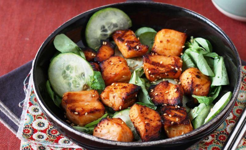 Mod de Preparare: Se combină sosul de soia, uleiul de susan, sriracha, mierea, usturoiul (opțional) și ghimbirul (opțional). Se taie somonul în bucăți mari și se adaugă la marinadă. Se amestecă bine. Puteți înveli bolul în folie alimentară și să lăsați somonul la marinat în frigider sau să îl folosiți imediat. Puneți bucățile de somon în tava de la Air Fyer și gătiți timp de 9 minute la 190°C. Savurați cu orez sau legume, sau folosiți-le pentru a anima o salată!