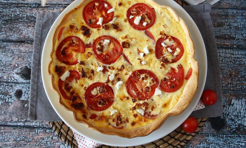 Mod de Preparare: Spălați și tăiați roșiile în felii. Sfărâmați feta. Cu ajutorul unui tel, amestecați ouăle și laptele cu puțină sare și piper. Desfaceți aluatul brisée în tava de tartă. Peste baza quiche-ului întindeți muștarul de Dijon, uleiul de măsline, rozmarinul uscat, pudra de usturoi, sarea și piperul, folosind o pensulă de patiserie. Aranjați feliile de roșii deasupra (păstrați cele mai bune felii pentru deasupra). Se presară feta mărunțită. Puneți deasupra amestecul de ou + lapte. Coaceți timp de 30 până la 40 de minute la 180°C. Acum este gata! Acest quiche este la fel de bun rece, pe cât este și cald!