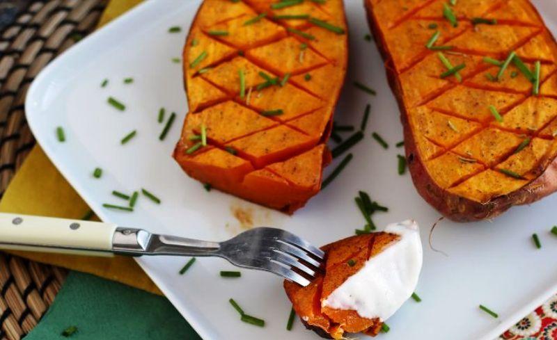 Între timp, pregătiți un sos din iaurt grecesc, sare, piper, arpagic tocat, suc de lămâie și ulei de măsline. Verificați gătirea cartofilor dulci: pulpa trebuie să fie moale, ușor de pătruns.