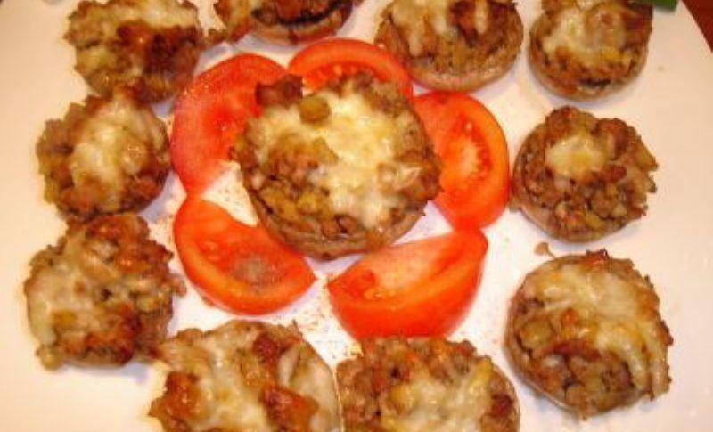 Mod de Preparare: Ceapa se toaca marunt si se caleste in putin ulei, se adauga carnea. Intre timp ciupercile se spala si li se rup piciorusele. Se sareaza si se pipereaza palariutele. Piciorusele se toaca marunt si cand carnea este aproape facuta, se pun si ele in tigaie sub capac. Se umplu ciupercile cu carne si se aranjeaza in tava. Se dau la cuptor pentru 30 minute, dupa care se scot si se aranjeaza pe fiecare cascaval ras. Se mai dau la cuptor 10 min.