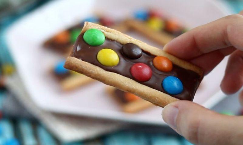 Mod de Preparare: Pregatiti aluatul sablée: amestecati zaharul, sarea, extractul de vanilie si untul moale. Adaugati oul si amestecati bine. Adaugati faina in mai multe randuri: incepeti prin amestecarea cu un tel, apoi terminati de incorporat cu mainile. Infasurati aluatul in folie alimentara, aplatizati-l si puneti-l in frigider timp de 15 minute. Intindeti aluatul pe o suprafață de lucru pudrata cu faina. Taiati dreptunghiuri de 9 x 4 cm. Adaugati benzi mici de 0,5 x 9 cm deasupra dreptunghiurilor de aluat, apasand ferm pentru a le lipi impreuna. Coaceti 10 minute in cuptor la 180° C, apoi lasati sa se raceasca complet. Umpleti interiorul fursecurilor cu ciocolata cu lapte, topita. In cele din urma, puneti M&M-uri sau Smarties de toate culorile peste ciocolata si dati-le la frigider timp de 15 minute.