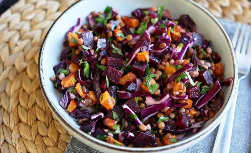 Mod de Preparare: Curată dovleacul și taie-l cubulețe. Într-un castron de salată, amestecați-l cu 1 lingură de ulei de măsline și 1 linguriță de miere. Se coace 25 de minute la 180°C. Între timp, pregătiți celelalte ingrediente: tăiați sfecla cubulețe, tăiați varza roșie în fâșii subțiri, tăiați pătrunjelul proaspăt, scurgeți lintea verde. Într-un castron de salată, amestecați lintea, sfecla roșie, varza roșie, pătrunjelul și dovleacul. Adăugați 2 linguri de ulei de măsline, 1 lingură de oțet, sare, piper și ... salata este gata: poftă bună!