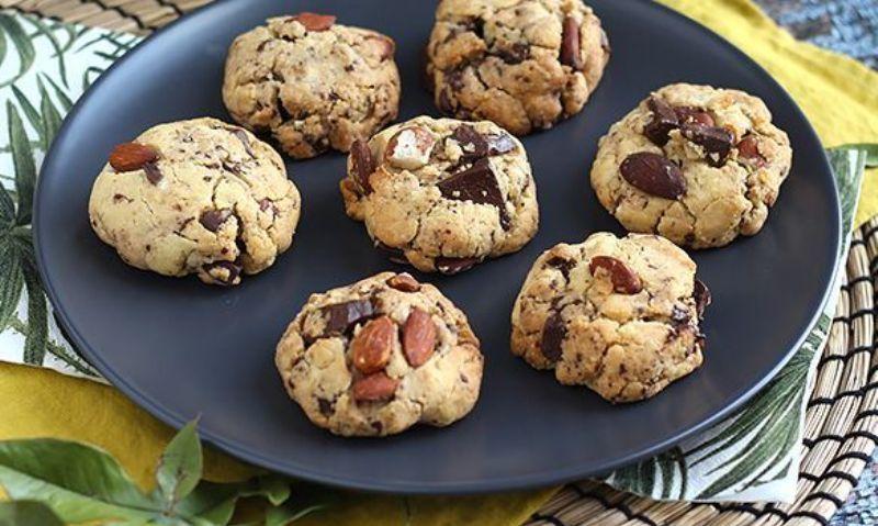 Mod de Preparare: Puneti arahidele intr-un chopper si amestecati pana obtineți o pasta neteda. Transferati intr-un castron si frecati cu oul si untul pana obtineti o textura cremoasa. Se adauga faina, praful de copt si zaharul brun. Tocam ciocolata si o adaugam la preparat impreuna cu migdalele. Incorporati totul bine. Cand amestecul este omogen, formati bile mici si așezati-le pe o tava de copt acoperita cu hartie de copt. Aplatizati bilele si coaceti timp de 10-12 minute la 180° C. Lasati sa se racesca.