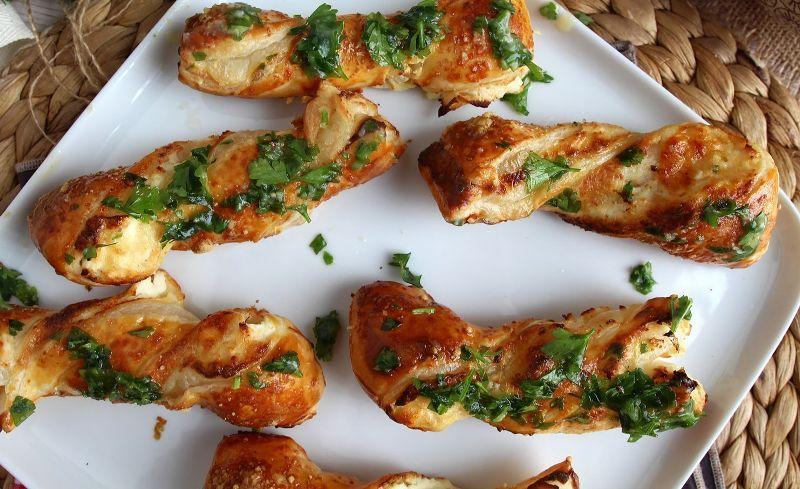 Mod de Preparare: Preîncălziți cuptorul la 180°C. Desfaceți aluatul foietaj și întindeți crema de brânză pe toată suprafața aluatului. Presărați parmezan deasupra (păstrați puțin pentru mai târziu). Îndoiți aluatul în jumătate și tăiați fâșii de cel puțin 2 cm grosime. Răsuciți fâșiile și așezați-le pe o tavă de copt acoperită cu hârtie de copt. Ungeți deasupra cu o pensulă, oul bătut. Presarați cu parmezan. Coaceți 20 de minute la 180°C. Topiți untul și adăugați praful de usturoi (sau usturoi proaspăt) și pătrunjelul proaspăt tocat. Amestecați bine. Ungeți baghetele cu amestecul anterior.