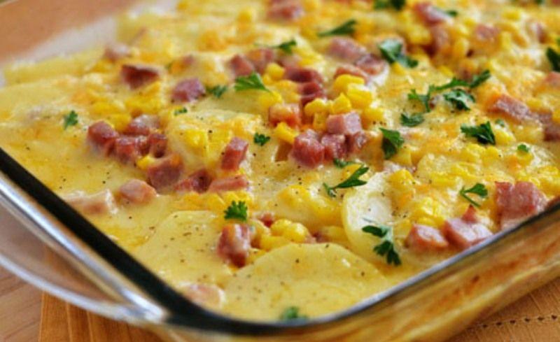 Mod de Preparare: Incalziti cuptorul la 200 grade celsius. Ungeti cu unt un vas tip Yena. Intr-o tigaie topiti cele 50 grame de unt, adaugati ceapa si caliti 2-3 minute, adaugati apoi sunca si caliti inca 3-4 minute; lasati tigaia la racit. Intr-un vas bateti cu telul smantana, laptele, faina, sarea si piperul. Cartofii se felieaza rondele subtiri cu ajutorul unui robot de bucatarie sau a unei razatoare. Puneti 1/3 din cartofi pe fundul vasului uns in prealabil cu unt, presarati deasupra 1/3 din compozitia de sunca/ceapa obtinuta anterior, 1/3 din branza/cascavalul ras, apoit turnati 1/3 din compozitia cu smantana, lapte, faina. Repetati acest procedeu de inca 2 ori, astfel incat la final sa presarati 1/3 din branza/cascaval si sa adaugati 1/3 din smantana, lapte, faina. Acoperiti vasul si lasati-l in cuptor 45-50 minute. Deasupra se pune patrunjel tocat. Se taie bucati si se serveste cald.