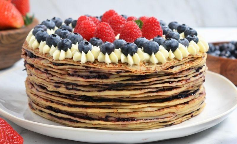 Ungi prima clătită cu cremă de brânză, adaugi următoarea clătită, o ungi cu cremă de ciocolată și continui alternativ până când termini ingredientele, deasupra fiind o clătită cu ciocolată. Torni deasupra glazura și dai tortul la rece. La final adaugi alunele zdrobite.