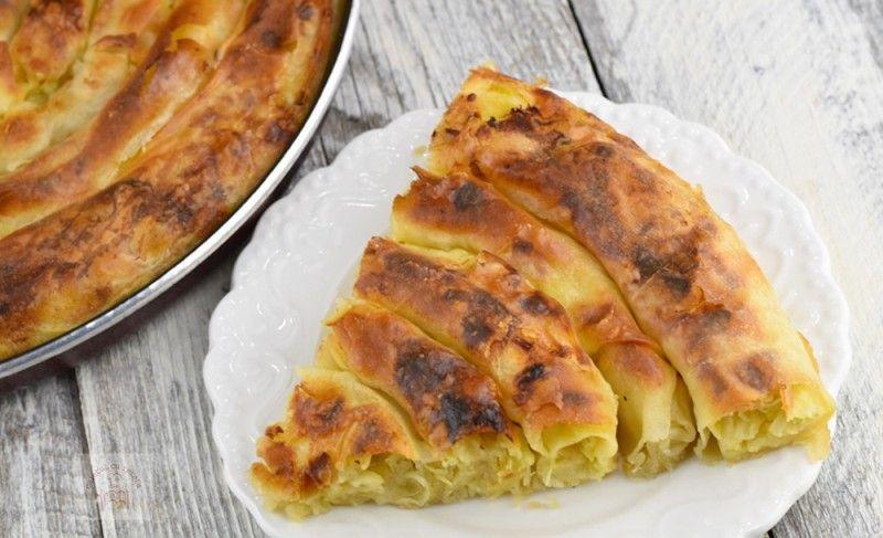 Mod de Preparare: Intr-o cratita, punem la foc moderat varza taiata marunt si prazul, in putin unt. Intre timp fierbem cartofii in apa cu sare, pe care apoi ii taiem felii.Intr-un bol facem sosul de smantana, lapte si oua. Potrivim de sare si piper. Pregatim tava, pe care o acoperim cu foile de placinta ca in imaginea de mai sus. Lasam 2 foi pentru ornat. Asezam cartofii peste foi; acoperim cartofii cu compozitia de varza si praz. Urnam sosul peste; inchidem placinta bine; o ungem cu unt topit si ou batut; o ornam cu celelalte 2 foi taiate fasii si o dam la cuptorul incins la aproximativ 30-40 minute.