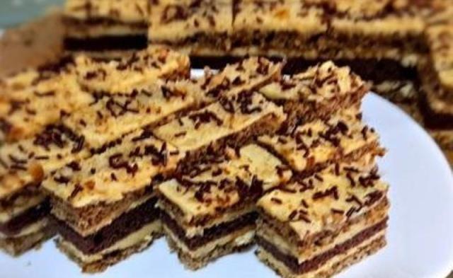 Mod de preparare: Preincalzim cuptorul la 180 de grade C. Mixam foarte bine albusurile cu un praf de sare pana incep sa capete consistenta, apoi adaugam putin cate putin zaharul. Continuam sa mixam pana cand obtinem o bezea tare si adaugam nucile macinate. Amestecam delicat iar apoi incorporam faina cernuta impreuna cu praful de copt. Acoperim o tava de 25×35 cm cu hartie de copt si punem compozitia, niveland-o bine. Coacem blatul 25-35 de minute la 180°C pana incepe sa se rumeneasca usor. Pentru siguranta facem testul cu scobitoarea. In cuptor blatul va creste destul de mult dar dupa racire se va lasa. Crema se prepara astfel. Intr-o craticioara amestecam foarte bine galbenusurile cu un praf de sare si zaharul pana cand vom obtine o compozitie cremoasa si deschisa la culoare. Apoi incorporam bine amidonul, turnam laptele si punem vasul pe foc. Amestecam continuu pentru a nu se lipi iar dupa ce da in fiert cam doua, trei clocote, stingem focul. Dupa cateva minute punem ciocolata si untul cubulete, esenta de rom si amestecam pana se incorporezaza bine. Lasam 10 minute sa se mai racoreasca si punem crema paste blatul bine racit, in tava in care a fost copt. Nivelam uniform si asezam deasupra biscuitii insiropati usor in cafea.