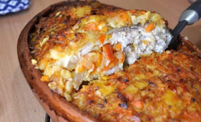 Mod de Preparare: Se pregatesc legumele pentru ghiveci si o oala/tava emailata sau de lut una de lut ar fi perfecta, mai ales daca e in forma de peste. Se pregateste ghiveciul de legume: se curata, se spala legumele, se taie bucatele si se calesc in ulei; se sareaza si se lasa sa fiarba, cu capac, pana cand se inmoaie. Se unge tava cu ulei si se aseaza un strat de ghiveci de legume. Deasupra se pune pestele intreg. Se umple si pestele cu cateva linguri de ghiveci si se acopera cu restul de ghiveci ramas. Se adauga ulei si se baga tava la cuptor, la foc potrivit, pentru cca. 2, 3 ore. Cand zarzavatul este bine inmuiat si pestele patruns, mancarea este gata.