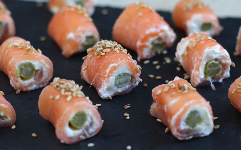Mod de Preparare: Asezati o folie de plastic pe o suprafata de lucru (un blat). Puneti o felie de somon afumat deasupra si aplicati cu generozitate crema de branza, asa cum se vede in fotografie. Adaugati un sparanghel verde in mijloc si rulati felia de somon. Apoi infasurati folia de plastic si puneti la frigider pentru cateva ore. Dupa ce scoateti din frigider, scoateti folia si presarati seminte de susan. Taiati felii de aproximativ 1 cm si ...rulourile de somon sunt gata!