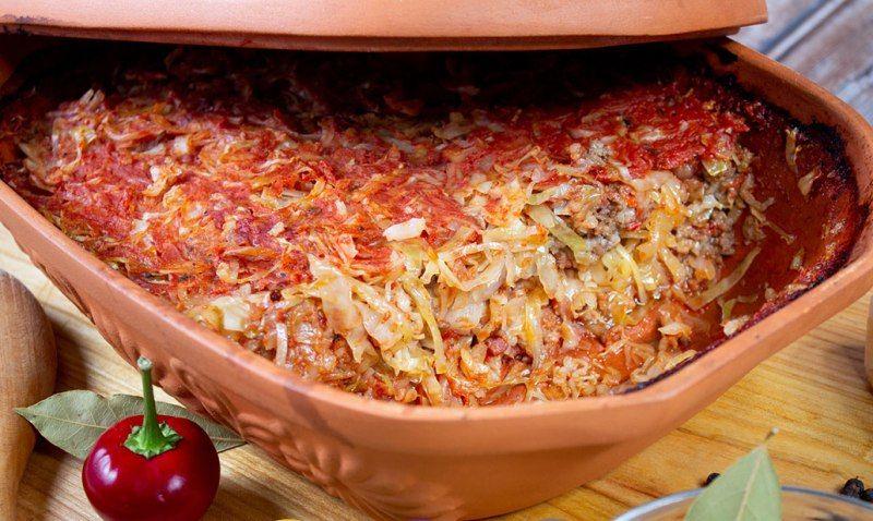 Mod de preparare: Rețeta începe cu călirea verzei murate într-o cratiță cu ulei și ceapă. După ce ceapa se înmoaie, se adaugă varza tăiată fin, frunzele de dafin, boiaua și piperul. Varza se gătește la foc mediu timp de 30 de minute, amestecând frecvent și adăugând apă, dacă este necesar. Într-o altă cratiță, se călește ceapa rămasă, se adaugă carnea tocată și se lasă până se rumenește. Separat, orezul se fierbe în apă cu sare până este aproape gata, apoi se combină cu carnea și pătrunjelul tocat. Apoi, într-o tavă se așază straturi succesive de varză și compoziția de carne cu orez, terminând cu un strat de varză. La final, preparatul se acoperă cu un amestec de smântână și suc de roșii, apoi se introduce în cuptorul preîncălzit la 180°C pentru aproximativ o oră.