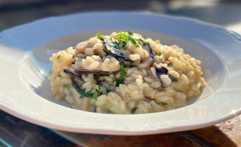 Mod de Preparare: Curatati ciupercile si taiati-le in bucati. Separati-le in doua parti. Intr-un bol de salata, diluati cubul de supa de legume in 500 ml de apa fierbinte. Intr-o cratita, se toarna o picatura de ulei de masline si se soteaza ceapa tocata, aproximativ 2 minute. Adaugati o parte din ciuperci si amestecati. Adaugati supa de legume diluata. Acoperiti si fierbeti timp de cateva minute la foc mic, astfel incat supa sa inmoaie ciupercile. Intr-o tigaie, turnati o picatura de ulei de masline si adaugati orezul. Se amesteca pana devine translucid. Adaugati vinul alb pentru a deglasa si continuati sa amestecati. Adaugati un polonic de supa si amestecati pana cand orezul a absorbit totul. Repetati pana cand ati terminat supa. Dupa ce ati adaugat ultimul polonic de supa la risotto, luati o tigaie pentru a gati cealalta jumatate de ciuperci. Adaugati o picatura de ulei de masline si caliti catelul de usturoi pentru cateva secunde. Adaugati ciupercile si caliti-le. La sfarsitul gatitului, adaugati patrunjelul tocat si pastrati putin pentru decor. In timp ce risotto-ul este in tigaie si ciupercile s-au calit, pregatiti un platou de servire! Într-un platou adanc, aranjati risotto-ul formand o gropita in centru. In interior asezati ciupercile prajite. Puneti patrunjel tocat si gata!