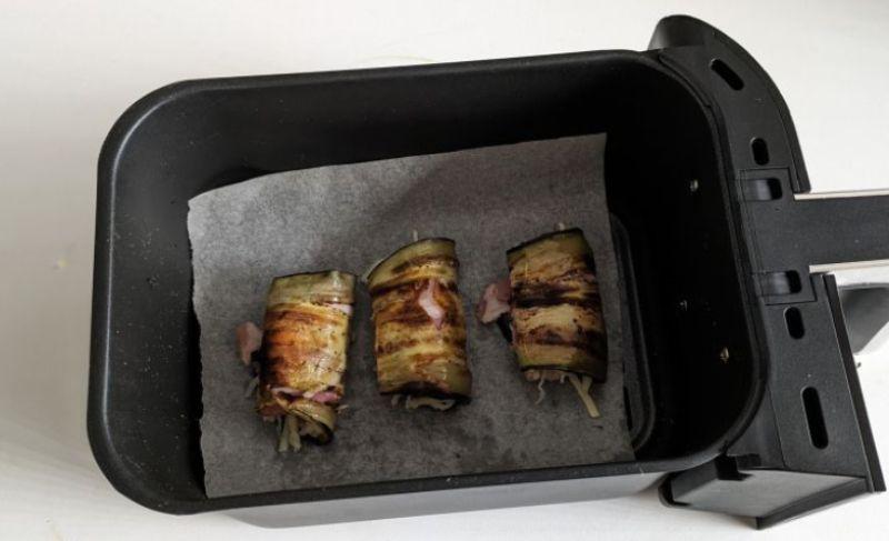 Mod de Preparare: Tăiați vânăta în felii (aproximativ 3 mm grosime) pe lungime. Nu le faceți prea subțiri, altfel va fi dificil să le rulați. Prăjiți într-o tigaie feliile de vinete. Lasați să se răcească, apoi adăugați o felie de piept de porc afumat/ bacon, puțină mozzarella rasa și un praf de piper la fiecare felie de vânătă. Înfășurați fiecare felie de vânătă cu umplutura și ungeți ușor involtinii cu puțin ulei de măsline (dacă este necesar, sigilați cu o scobitoare). Pune rulourile în coșul friteuzei cu aer (tapetat cu hârtie de copt) și gătiți timp de 6 minute la 200°C.