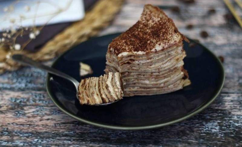 Ansamblare: Așezați toate clătitele pe o farfurie, așezați inelul deasupra și decupați marginile clătitelor astfel încât să fie toate de aceeași dimensiune. Puneți cercul pe platoul de servire. Puneți două clătite una peste alta, în cerc. Întindeți o lingură de smântână pe toată suprafața clătitei. Presarați cu pudră de cacao. Apoi puneți iar o clătită, întindeți deasupra crema tiramisu și pudrați cacao. Repetați operațiunea până la ultima clătită. Pe ultima clătită se întinde frișcă apoi se acoperă cu folie alimentară și se dă la frigider pentru 1 oră. Pudrați deasupra și părțile laterale ale tortului cu pudră de cacao. Acum este gata!