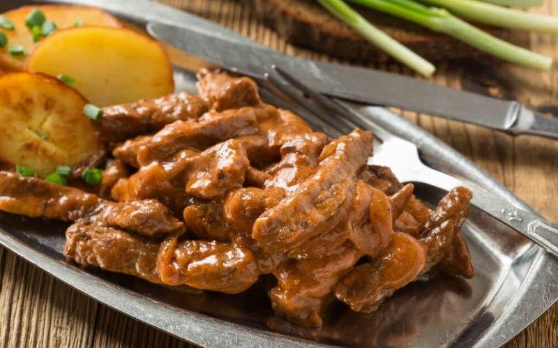 Mod de Preparare: Taiati crupa de vita in fasii. Amestecati faina cu paprika si treceti fiecare felie de carne prin acest amestec. Puneti carnea sa se gateasca intr-o tigaie cu ulei fierbinte. Gatiti rapid, aproximativ 3 minute, apoi dati-o deoparte. Se incalzeste uleiul intr-o tigaie si se caleste ceapa tocata. Adaugati ciupercile taiate in bucati si usturoiul zdrobit. Gatiti pana cand ciupercile devin fragede. Adaugati apa, cubul de bulion, sosul Worcestershire, concentratul de rosii, sare si piper. Se amesteca bine si se lasa sa gateasca timp de zece minute pentru a se reduce sosul. In cele din urma, adaugati smantana, sucul de lamaie si carnea. Se amesteca bine si se lasa sa fiarba. Serviti cu orez sau paste fainoase.