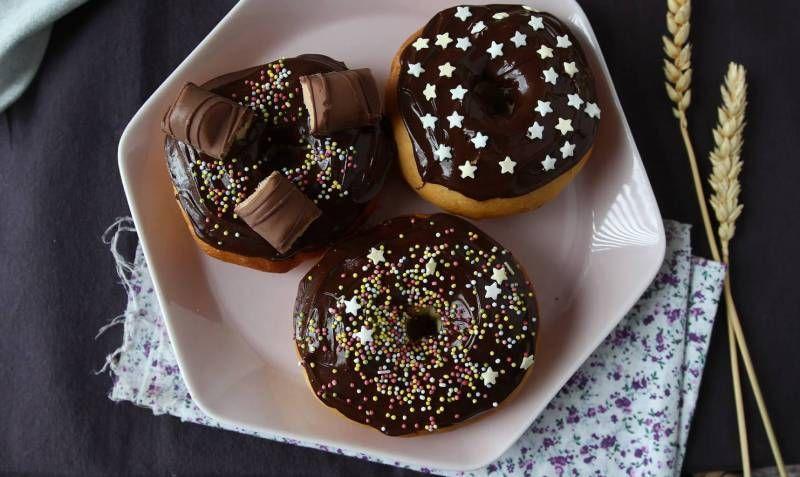 Mod de Preparare: Rehidratați drojdia uscată de panificație în lapte călduț (dar nu fierbinte). Lăsați sa stea 10 minute la temperatura camerei. Turnați făina în vasul mixerului. Adăugați zahărul și sarea pe o parte apoi acoperiți cu faină. Faceți o mică gropiță. Adăugați oul, amestecul de lapte/drojdie și aroma de vanilie în gropiță. Frământați totul timp de 5 minute. Adăugați puțin câte puțin untul moale în timp ce frământați. Când este bine încorporat, frământați încă 5 minute. Aluatul rezultat trebuie să fie neted și suplu. Faceți o bilă și lăsați aluatul să crească în vas, acoperit cu un prosop curat timp de 2 ore la temperatura camerei (cel mai bine este să puneți vasul într-un loc cald). Degazați aluatul pentru a elimina aerul format și se formați bile de 60 gr. Așezați biluțele de aluat pe o tavă de copt acoperită cu hârtie de copt, distanțați-le bine (va trebui să folosiți două tăvi) și faceți o gaură în centru înainte de a forma gogoșile. Acoperiți cu un prosop curat și lăsați să se odihnească timp de 1 oră până la 1 oră 30 de minute, la temperatura camerei. Coaceți gogoșile timp de 10 minute în cuptorul preîncălzit la 180°C. Topiți ciocolata și scufundați gogoșile în ea. Stropiți cu toppingurile la alegere și savurați!