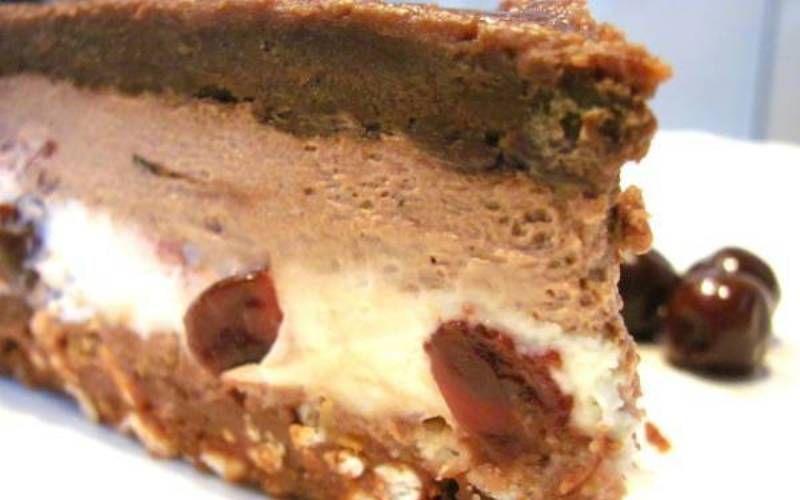 Crema: Batem 250 ml fisca lichida cu 2 linguri de zahar, cand frisca s-a intarit adaugam 250 g mascarpone si coaja de lamaie, mixam pana se omogenizeaza. Turnam crema peste stratul de ciocolata nivelam si punem visinele, pe care le apasam sa se scufunde in crema.