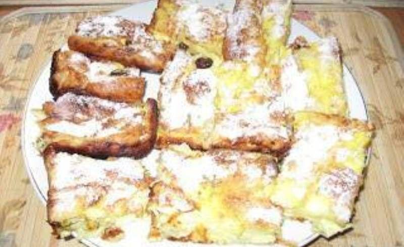 Separat intr-un castron punem branzica scursa in prealabil de zeama, ouale unul cate unul, se amesteca bine, se adauga zaharul vanilat si esenta de vanilie dupa gust. Foile se intind pe rand ,se ung cu ulei,se aseaza compozitie doar pe jumatate de foaie si se presara stafide dupa gust.Se aduce cealalta jumatate de foaie deasupra compozitiei,se aduna prin incretire si se aseaza in tava unsa foarte bine cu ulei. Inainte de a introduce tava in cuptorul preincalzit in prealabil cu cca 15 minute, turnam deasupra amestecul format din 2 oua, o lingura de ulei si 12 linguri de iaurt. Dupa ce se raceste putin se presara cu zahar pudra, se taie in forma si dimensiunea dorita. Merge si un paharel de vin.