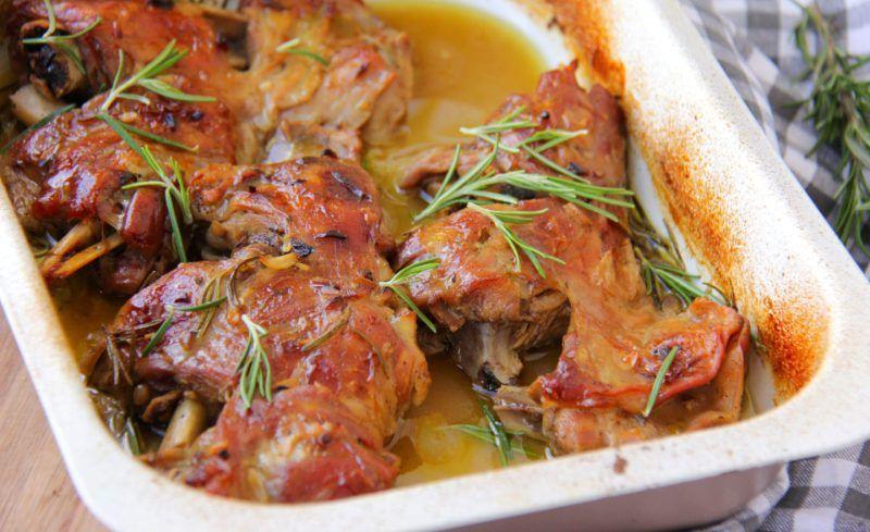 Separam pulpele de restul carnii si taiem cu un cutit ascutit pielitele mai groase, insa nu indepartam si grasimea, intrucat aceasta, da o savoare excelenta preparatului nostru. Spalam bine pulpele si apoi facem crestaturi folosind varful cutitul, pentru a le umple cu arome si pentru a permite vinului pe care il vom adauga ulterior, sa patrunda bine in carne. Asezam pulpele intr-un recipient suficient de inalt si incepem sa umplem golurile din crestaturi, mai intai cu cate o boaba de piper in fiecare crestatura, iar apoi cu mixul de ingrediente uscate. Dureaza cam 10 – 15 minute aceasta metoda de aromare a carnii, insa carnea va capata o aroma puternica dupa cateva zile, veti vedea in final, merita. Adaugam in vas uleiul de floarea soarelui, apoi vinul alb si cel rosu. Daca aveti posibilitatea, folositi un vin de tara. Cu cat vinul cumparat va fi mai ieftin, cu atat gustul preparatului final, nu va fi cel asteptat. In concluzie, nu va zgarciti la vin. Amestecam si acoperim recipientul cu folie si il introducem in frigider. Dupa doua zile, intoarcem carnea, astfel incat sa se patrunda uniform pe toate partile. Noi tinem la fezandat in acest fel, minim 3 zile, dar nu mai mult de 6. Apoi il tinem la cuptor aproximativ 3 ore, impreuna cu jumatate din zeama in care a stat la fezandat. Scoatem o parte din foile de dafin cand introducem tava in cuptor. In primele 2 ore tava este acoperita cu folie de aluminiu pentru a se innabusi carnea. Apoi, scoatem folia si intoarcem carnea pentru a se rumeni. Tot atunci gustam zeama si o echilibram, dupa gust, cu sare si piper. Temperatura nu trebuie sa fie foarte mare, este in regula la 150 – 160 grade. Zeama va scadea, iar carnea va fi foarte frageda si aromata si … se va topi in gura.