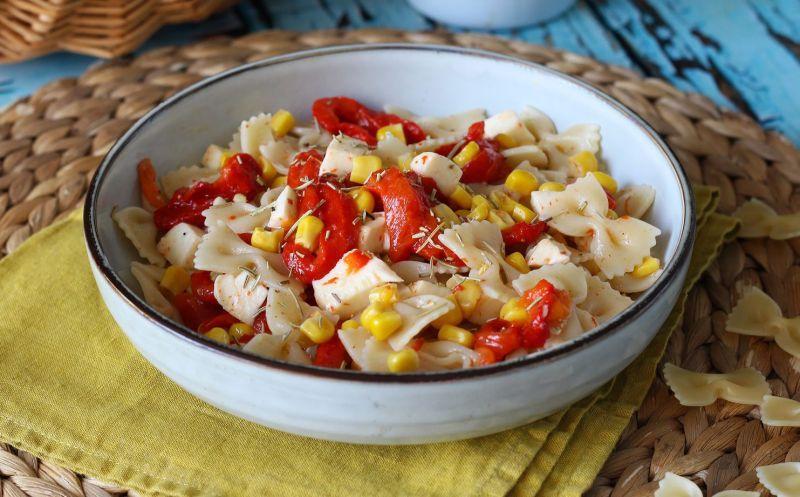 Mod de Preparare: Pregătiți ardeiul copt folosind cuptorul: 25 de minute la 230 ° C. Apoi lăsați-l să se răcească într-o pungă închisă. Apoi descojiți-l și tăiați-l în benzi. Dați deoparte. Între timp, gătiți pastele ”al dente” în apa sărată. Scurgeți-le și dați-le sub jet apă rece pentru a opri gătitul. Transferați pastele într-un bol și adăugați ardeii, mozzarella tăiată, porumb, piper, rozmarin uscat și ulei de măsline. Amestecați bine și gustați. Nu ar trebui sa fie foarte sărate, deoarece am trecut pastele sub jet de apă. Adăugați sare în funcție de gusturile voastre.