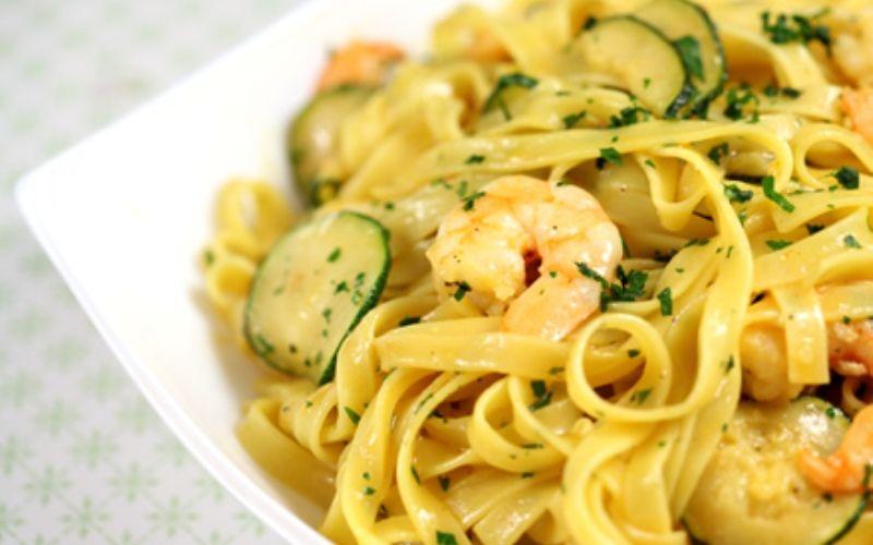 Mod de Preparare: Feliem subtire dovlecelul, incingem putin ulei de masline intr-o tigaie, adaugam ceapa marunt tocata si o calim. Adaugam crevetii, ii rumenim foarte putin. Turnam vinul si lasam sa se evapore. Adaugam supa de legume, dovlecelul feliat si lasam pe foc aproximativ 5 minute. La final adaugam smantana si patrunjelul tocat. Potrivim de sare apoi amestecam cu pastele fierte.