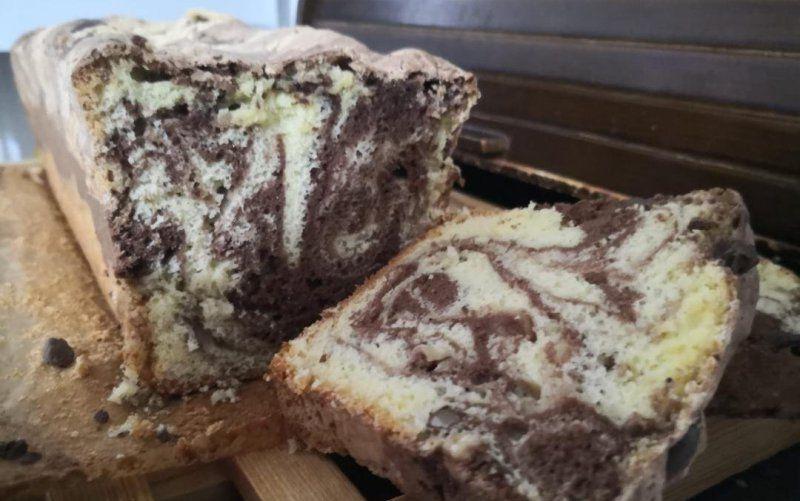 Mod de Preparare: Se separa albusul de galbenus de la cele 5 oua. Galbenusurile si 200 gr din cantitatea de zahar se freaca pana se albesc. Treptat se pun cele 5 linguri de ulei si apoi cele 3 linguri de apa fiarta (una cate una). Albusurile cu un praf de sare si 100 gr din cantitatea de zahar, se bat spuma. Peste galbenusuri se adauga albusurile batute spuma. Nu amestecati! Apoi faina cernuta, esenta de vanilie si coaja de lamaie netratata. Se incorporeaza acum toate ingredientele, amestecand usor de jos in sus, cu o spatula. Din compozitia rezultata se ia 1/3 si se amesteca cu 2 linguri cu varf de cacao. Tava de copt se tapeteaza cu hartie de copt si se toarna compozitia galbena, distribuind uniform. Am presarat acum jumatate din miezul de nuca. Apoi se toarna si compozitia cu cacao si cu ajutorul unei furculite si amesteca usor de jos in sus, astfel incat sa incorporam compozitia cu cacao in cea cu galbena. Nu amestecati! deasupra punem restul de miez de nuca si petite sau banuti de ciocolata. Se incalzeste cuptorul la 170° si se introduce checul nostru pentru 40-45 minute.