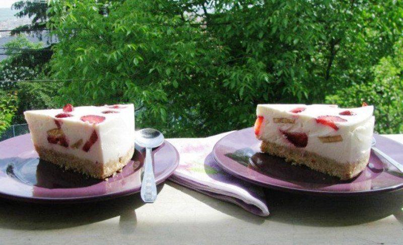 Mod de Preparare: Se incalzaste laptele cu 100 de grame de zahar, untul si aromele dupa care se toarna peste biscuitii sfaramati si se amesteca bine. Produsul obtinut se pune intr-o forma te tort cu pereti detasabili. Acesta va fi baza tortului. Intr-un bol separat se amesteca mascarpone cu iaurtul, impreuna cu zaharul ramas si cu capsuni. Se prepara gelatina si se toarna peste amestec. Amestecul obtinut apoi se pune deasupra bazei si se pune in frigider pentru cateva ore. Tortul de vara cu mascarpone si iaurt se taie felii si se poate orna cu diferite fructe sau cu frunze proaspete de menta.