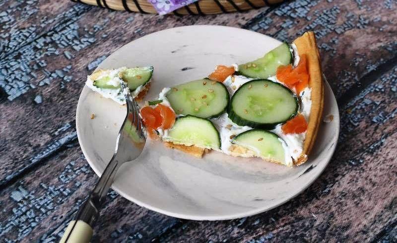 Între timp, se pregătește umplutura: Se amestecă ricotta, sucul de lămâie, coaja de lămâie și ceapa verde tocată. Se pune bolul la frigider în timp ce se prepară restul. Castravetele se taie în felii subțiri. Somonul afumat se taie în fâșii. Se răstoarnă foitajul copt pe vasul de servit și se umple baza de tartă cu umplutura de ricotta. Așezați feliile de castravete deasupra. Apoi adăugați fâșiile de somon rulate în golurile rămase. Se presară cu semințe de susan (sau alte semințe) și ceapa verde tocată. Se poate adăuga și coajă de lămâie. Și acum tarta dvs. extra proaspătă este gata de savurat.