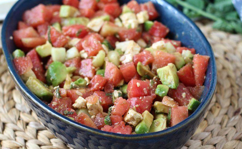 Mod de Preparare: Tăiați pepenele verde, feta, castraveții și avocado în cuburi. Amestecați-le într-un bol de salată, apoi adaugați menta tocată. Adăugați ulei de măsline, oțet balsamic, suc de lime. Amestecați și e gata! Poftă bună!