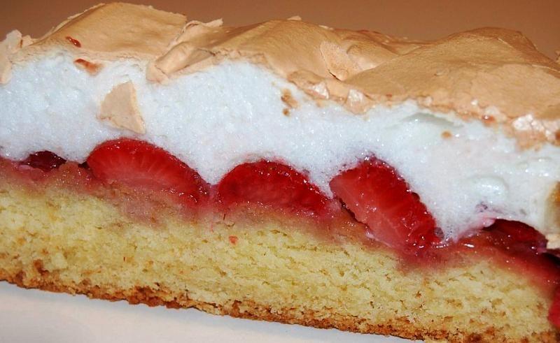 Mod de Preparare: Intr-un vas se freaca galbenusurile de oua cu 200 g de zahar. Cand pasta se deschide la culoare se adauga laptele, uleiul, faina si praful de copt, si se amesteca bine pana rezulta un amestec fara cocoloase. Se adauga zaharul vanilat, zeama si coaja rasa de la o lamaie si se omogenizeaza amestecul. Se toarna pasta intr-o tava tapetata cu hartie de copt si se da la cuptorul preincalzit pentru 30 minute. Dupa 30 de minute blatul este aproape copt si se poate scoate din cuptor. Se pun deasupra capsunile taiate jumatati si se presara cu zahar brut. Se mai da la cuptor pentru 10 minute. Intre timp albusurile, la care s-au adaugat 2 linguri de zahar, se bat spuma. Cand s-au scurs cele 10 minute, scoatem tava din cuptor, si spritam spuma peste capsuni. Inapoi la cuptor pentru nu mai mult de 5 minute, pana cand albusul se rumeneste un pic.
