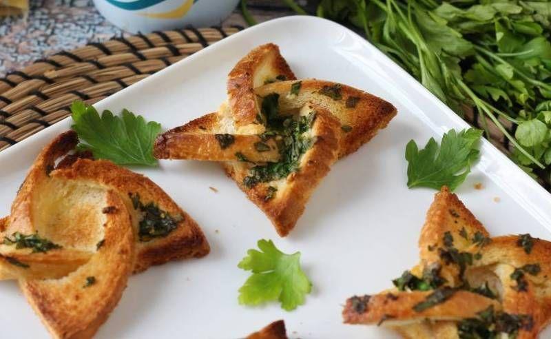 Mod de Preparare: Folosind un cuțit, tăiați felia de pâine feliată începând de la un colț, ușor în diagonală (spre partea opusă), dar nu până la capăt. Se repetă operațiunea cu cele 4 colțuri ale feliei de pâine. Îndoiți ușor o parte spre centru, fără a o rupe. Așezați următoarea parte deasupra celei anterioare. Repetați operațiunea. Pentru ultimul colț, pliați sub primul pentru a menține steaua în poziție. Se prepară amestecul de pătrunjel amestecând pătrunjelul, uleiul de măsline, usturoiul, sarea și piperul. Presărați pătrunjelul peste stele. Formați stelele rămase.