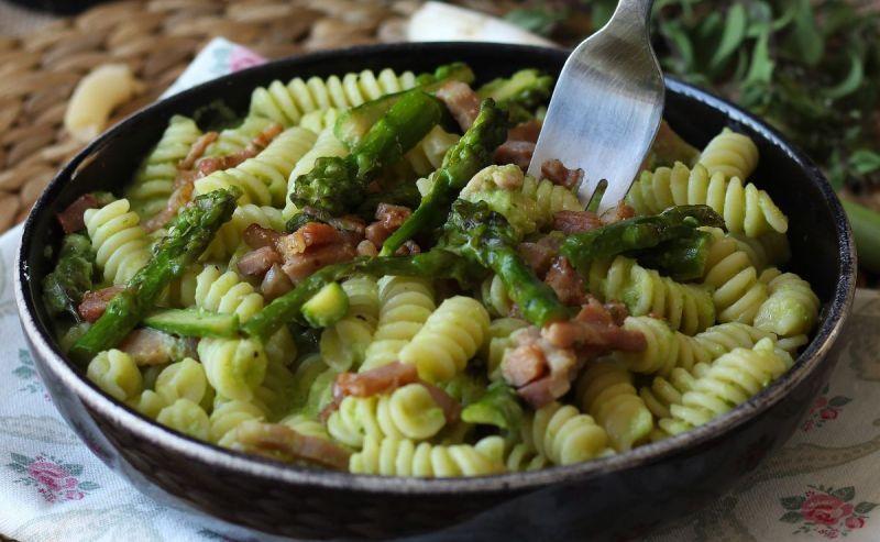 Mod de Preparare: Se spală sparanghelul sub jet de apă, se curăță prin îndepărtarea părții albe a tulpinii, se taie sparanghelul în rondele și se despică vârfurile în două. Se rumenește eșalotul în ulei de măsline într-o tigaie. Se adaugă sparanghelul curățat și se rumenește la foc mare timp de câteva minute. Se toarnă apă fierbinte (mai mult de o jumătate de pahar dacă preparatul este pentru două persoane) și se continuă gătitul cu capacul pus timp de aproximativ 8 minute. După ce a trecut timpul specificat, se scot vârfurile de sparanghel și se pun deoparte. Se transferă feliile de sparanghel împreună cu apa de gătit în blender. Se adaugă două linguri de parmezan, un praf de piper și busuiocul. Apoi se mixează până se obține o compoziție netedă și omogenă. Se fierb pastele în multă apă clocotită sărată. În aceeași tigaie folosită pentru gătitul sparanghelului, se gătește baconul fără a mai adăuga grăsime. Când începe să se rumenească, se adaugă vârfurile de sparanghel puse deoparte și se continuă gătitul pentru câteva minute. Când se termină de gătit, se transferă pe o farfurie și se pun deoparte. Se toarnă crema de sparanghel în tigaie. Scurgeți pastele al dente și transferați-le în tigaia cu cremă. Se amestecă rapid pentru a amalgama aromele. Se adaugă baconul și sparanghelul fiert, având grijă să se păstreze o parte pentru decorarea finală a mâncărurilor. Se adaugă brânza parmezan și se amestecă bine.