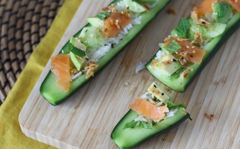 Mod de Preparare: Gătiți orezul conform instrucțiunilor de pe pachet. Lăsați să se răcească sau clătiți sub apă rece și scurgeți. Tăiați castravetele în jumătate, pe lungime. Răzuiți pulpa și tăiați-o în bucăți mici. Umpleți interiorul cu orez fiert, pulpă de castraveți, avocado tăiat cubulețe și cubulețe de somon/păstrăv afumat. Presărați ceapă prăjită, semințe de susan și mentă proaspătă tocată. Gata!