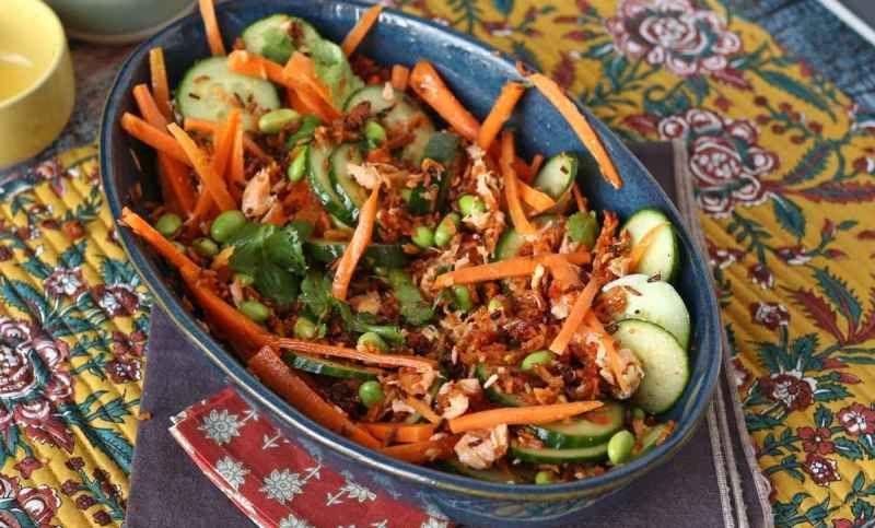 Mod de Preparare: Se fierbe orezul în apă cu capac timp de 10 minute. Se lasă la răcit. Cel mai bine este să folosiți orezul fiert din ziua precedentă sau orezul rămas! Coaceți fileul de somon timp de 8-10 minute la 180°C. Acesta va trebui apoi să fie sfărâmat. Se amestecă orezul fiert rece cu pudra de curry roșu și uleiul și se întinde pe o tavă rezistentă la cuptor. Se coace timp de 40 de minute la 200°C, amestecând la fiecare 10 minute aproximativ. Se lasă să se răcească timp de aproximativ 30 de minute. Se taie morcovii în bastonașe subțiri și castravetele în felii subțiri. Se îndepărtează frunzele de la coriandru. Se amestecă sosul de soia, cățelul de usturoi zdrobit, ghimbirul zdrobit, sucul și coaja de lime. Se pun ingredientele pentru umplutură într-un bol de salată sau într-un vas mare. Se adaugă orezul crocant deasupra. Se toarnă sosul și se amestecă bine.