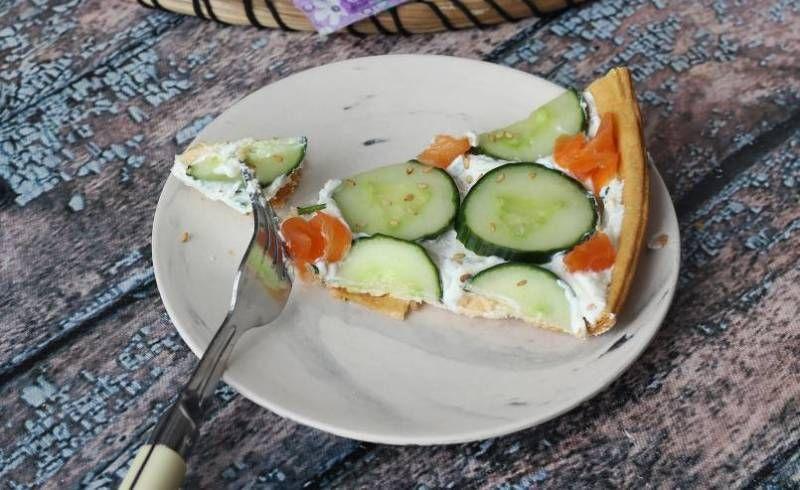 Mod de Preparare: Desfășurați foitajul în forma de tartă răsturnată. Se unge forma pentru siguranță, se unge deasupra cu puțin unt topit. Se presară cu semințe de susan sau alte semințe. Adăugarea de unt și semințe este opțională. Puteți înțepa aluatul pentru a-l împiedica să se umfle atunci când este gătit. Coaceți aluatul timp de 20 de minute la 200°C. Se scoate din cuptor și se lasă să se răcească. Între timp, se pregătește umplutura: Se amestecă ricotta, sucul de lămâie, coaja de lămâie și ceapa verde tocată. Se pune bolul la frigider în timp ce se prepară restul. Castravetele se taie în felii subțiri. Somonul afumat se taie în fâșii. Se răstoarnă foitajul copt pe vasul de servit și se umple baza de tartă cu umplutura de ricotta. Așezați feliile de castravete deasupra. Apoi adăugați fâșiile de somon rulate în golurile rămase. Se presară cu semințe de susan (sau alte semințe) și ceapa verde tocată. Se poate adăuga și coajă de lămâie. Și acum tarta dvs. extra proaspătă este gata de savurat.