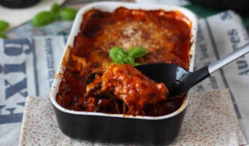 Între timp, spălați vinetele și tăiați capetele. Tăiați-le pe lungime la o grosime de aproximativ 5 mm (puteți folosi și o mandolină reglabilă). Într-o tigaie cu margini înalte, încălziți uleiul și prăjiți feliile de vinete. Imediat ce devin aurii, scurgeți-le și lăsați-le sa se odihneasca pe hârtie absorbantă.